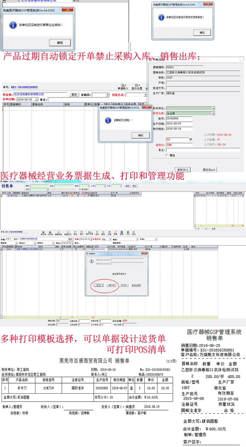 物品过期了,自动锁定,不让进货销售。批号管理企业首营许可证到期提醒,首营产品管理、温湿度登记、产品过期提醒、严格按照药监局验收标准。