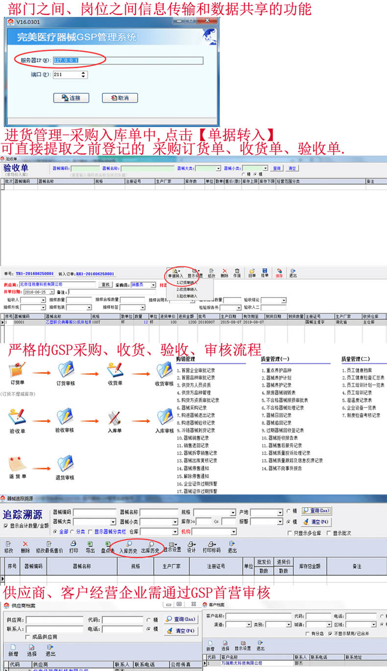 医疗器械设备二三类GSP验收认证软件除带有进、销、存及财务管理等功能外,符合最新版GSP的要求。