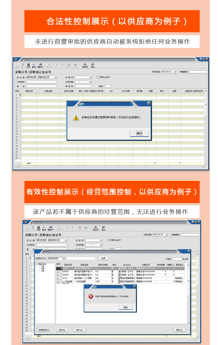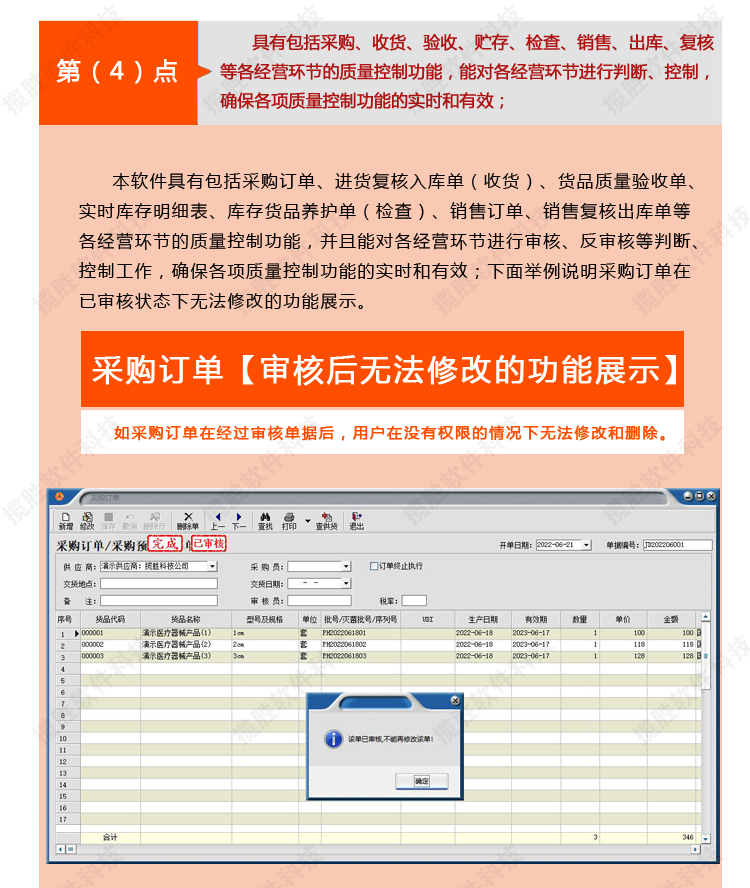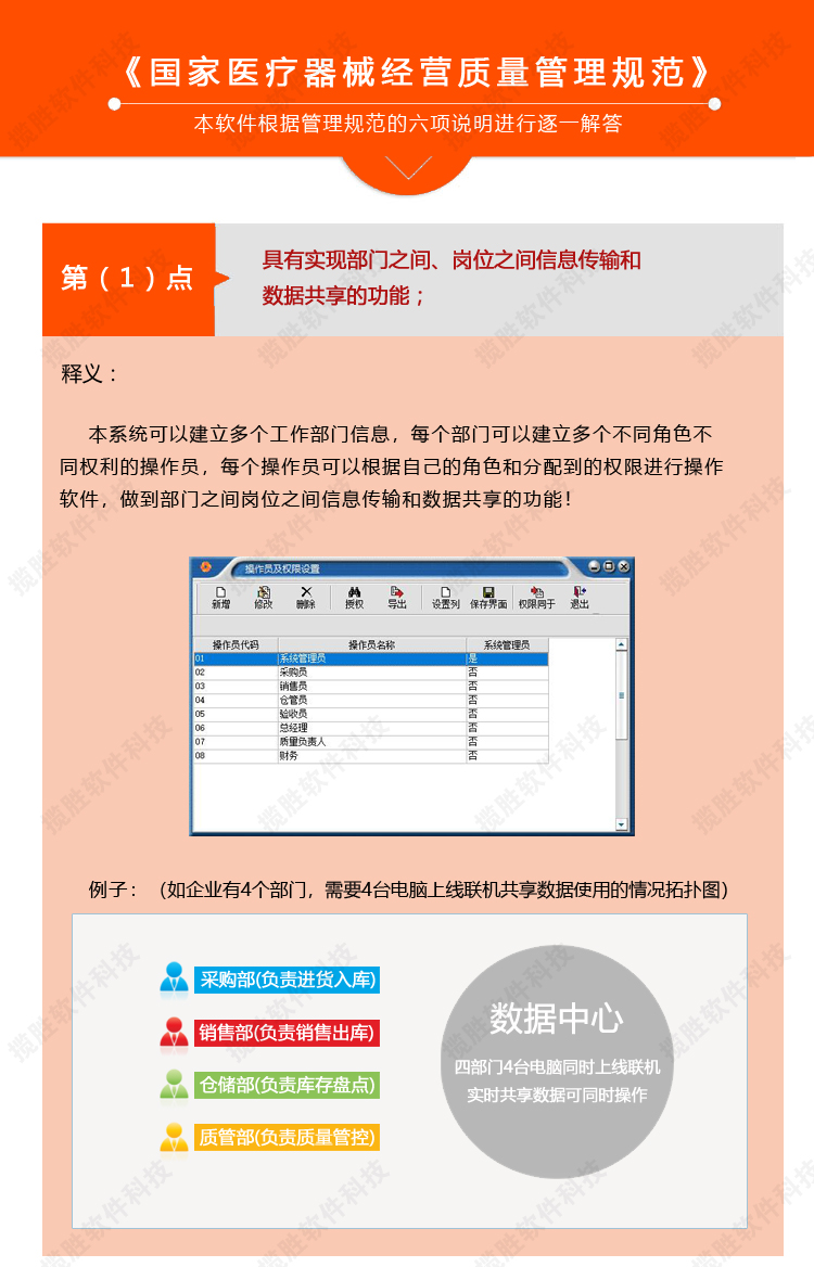 【我们的医疗器械软件 符合药监部门最新验收标准】:系统严格按照国家药监部门医疗器械质量管理规范的要求开发,系统不仅提供首营管理、入库验收、出库复核、库存养护、效期药品催销等的整套质量管理规范流程控制,相关质量管理记录自动生成,在广东省、江西省、辽宁省、福建省、浙江省、云南省、江苏省、海南省、河南省、河北省、湖北省、湖南省、山西省、山东省、安徽省、黑龙江省、四川省、贵州省、陕西省、甘肃省、青海省、广西、新疆、内蒙古、西藏、宁夏、北京市、上海市、广州市、深圳市、重庆市、天津市等全国23个省、五个自治区和四个直辖市使用完美双赢医疗器械软件的医疗器械企业都通过药监验收。